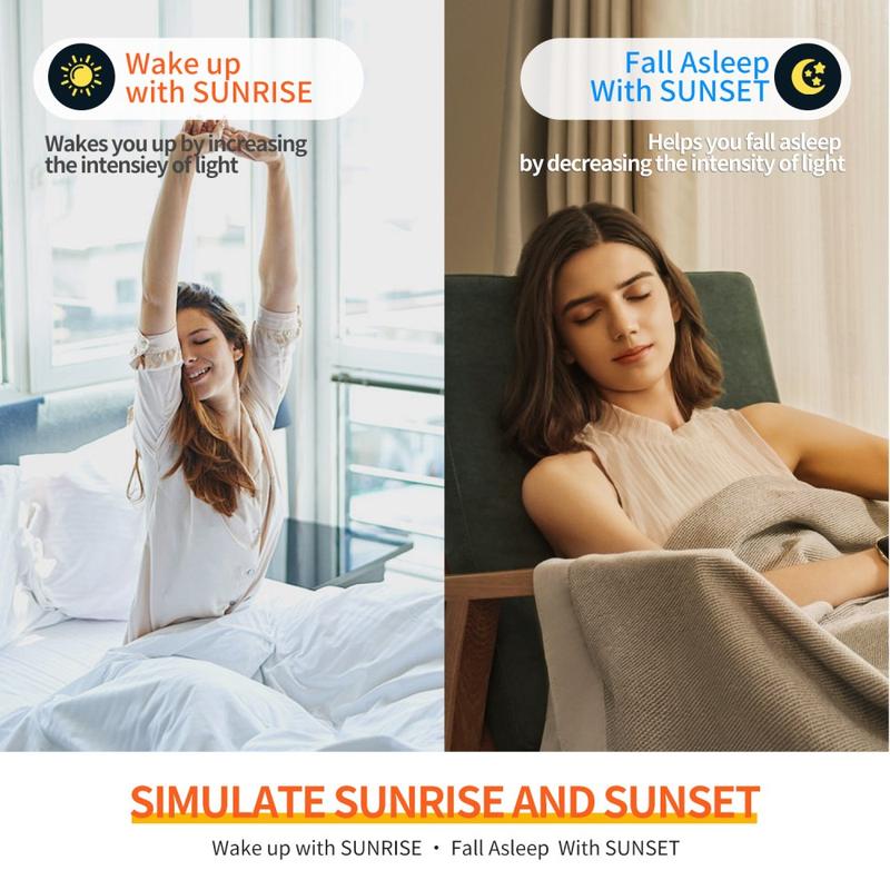 - Sanftes Aufwachen: Verwenden Sie das Sonnenaufgangslicht mit einem sanften Weckton für ruhigere Morgenstunden