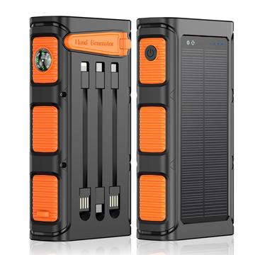 Solar-Powerbank 20000mAh mit Handkurbel, LED-Taschenlampe und integrierten Kabeln - Orange / Schwarz
