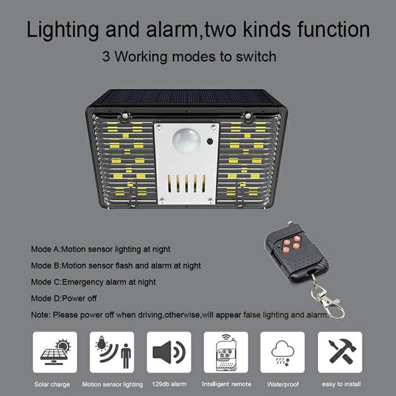 • Solarbetriebene LED-Außenleuchte mit Sicherheitsalarm N775 - 129 dB LED-Lampe für Sicherheit und Garten, 4 Beleuchtungsmodi, IP55 wasserdicht