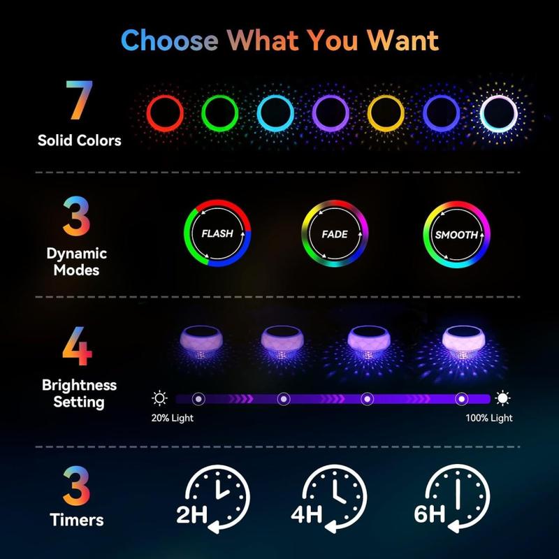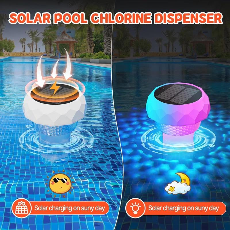 Erhellen Sie das nächtliche Schwimmen und halten Sie das Wasser klarer, ohne Kabel oder Batterien. Diese solarbetriebene schwimmende Lampe kombiniert einen leistungsstarken RGB-LED-Ring mit einer internen Desinfektionsbox, die zusammenarbeitet, um das Algen- und Bakterienwachstum zu begrenzen. Ein monokristallines 5-V-Panel lädt die 1200-mAh-Lithiumbatterie bei Tageslicht auf, dann schaltet sich die Lampe bei Dämmerung automatisch ein und bietet bis zu zwölf Stunden lang leuchtende Farben. Mit der Fernbedienung können Sie zwischen acht festen Farbtönen und drei Farbwechselshows wählen und den integrierten Timer auf 4, 6 oder 8 Stunden einstellen - perfekt für Pools, Whirlpools und Zierteiche.