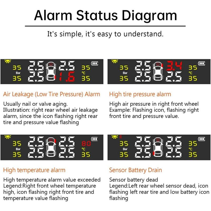 - Umfassende Warnungen: Warnungen bei hohem/niedrigem Druck, schneller Leckage, hoher Temperatur und niedrigem Batteriestand sorgen dafür, dass Sie bei Problemen immer einen Schritt voraus sind
