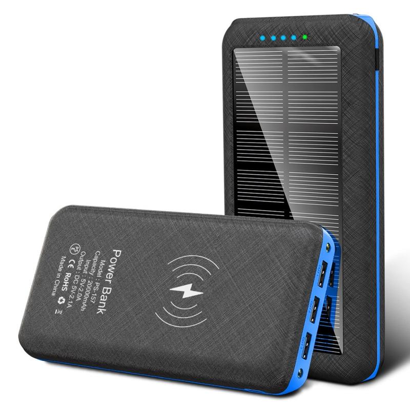 Solarstrom-Ladegerät 20000mAh mit drahtloser Aufladung, 3x USB-Anschlüsse, Dual-LED-Taschenlampe