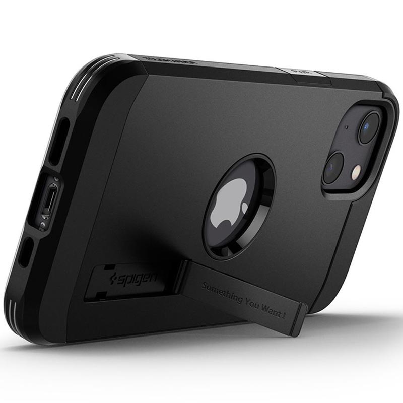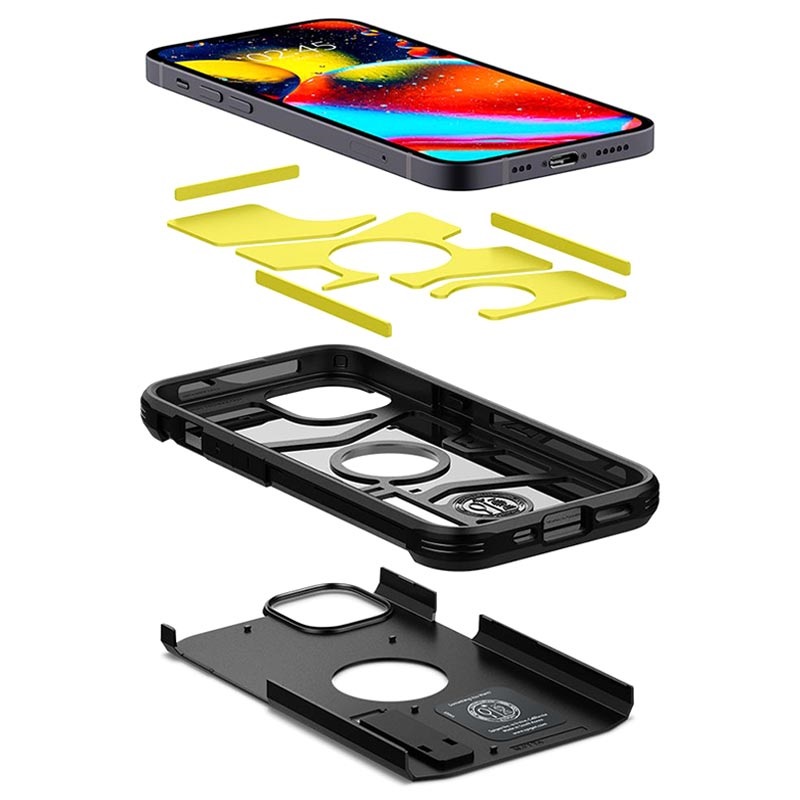 Die Tough Armor-Serie von Spigen wurde speziell entwickelt, um schlank und dennoch extrem schützend zu sein! Ein fantastisches Fernseherlebnis mit einem eingebauten Kickstand ermöglicht es Ihnen, Ihre Lieblingssendung ganz einfach auf Ihrem iPhone 13 anzusehen, ohne ihn ständig festhalten zu müssen. Doppellagiges TPU und ein Case aus hartem Polycarbonat, Abdeckungen für Tasten und Ausschnitte für Anschlüsse sowie erhöhte Kanten, die Kamera und Bildschirm kratzfrei halten - die Tough Armor-Serie bietet den Schutz, auf den Sie sich verlassen können! Das iPhone 13 Case hat auch eine erhöhte Lippe, die Ihnen hilft, Kratzer und andere Schäden zu vermeiden, wenn Sie Ihr Telefon mit der Vorderseite nach unten auf eine flache Oberfläche legen.