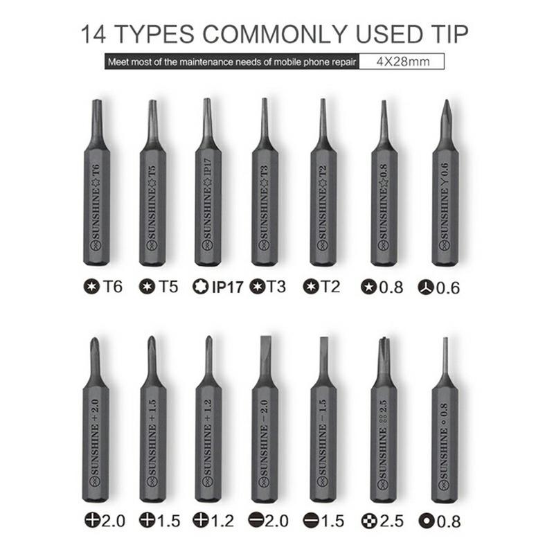 - Enthält 14 magnetische Bits aus S2-Legierungsstahl für gängige Reparaturarbeiten