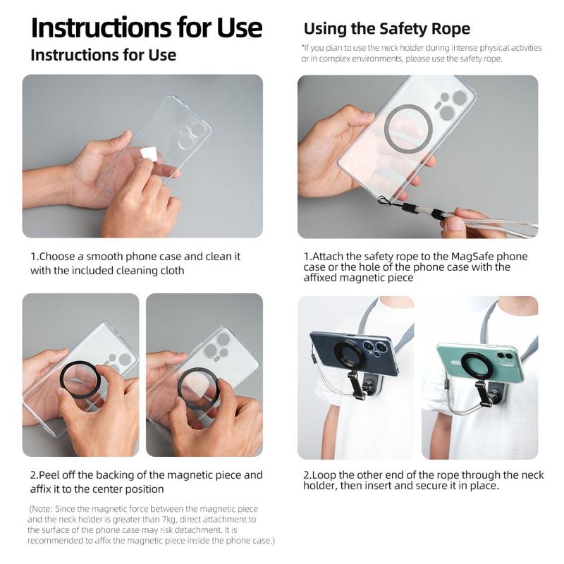 3. Für die Verwendung von Sicherheitsseilen ist eine Handyhülle erforderlich; ein Ende des Sicherheitsseils wird an das Loch in der Handyhülle gebunden; das andere Ende wird an den hängenden Hals gelegt, der hängende Hals verriegelt und die Einstellschnalle des Sicherheitsseils auf das Minimum gezogen