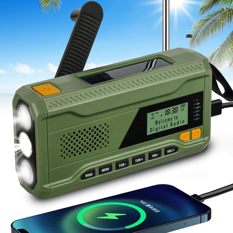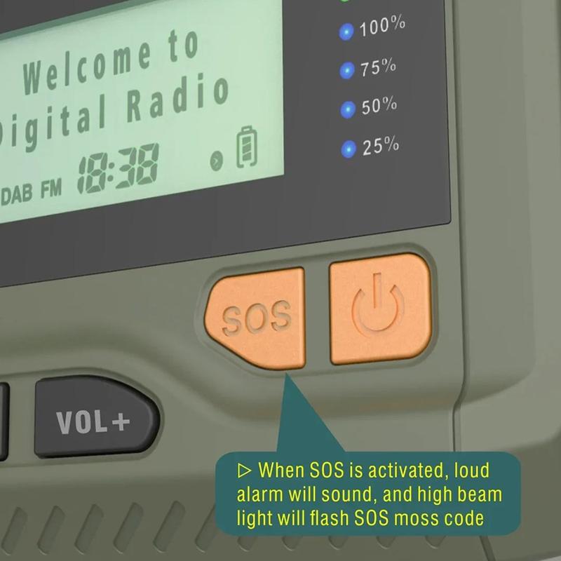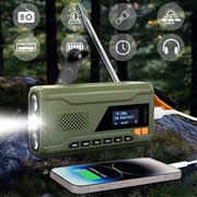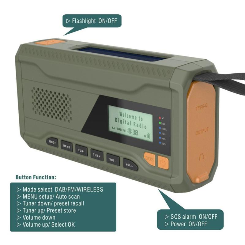 Das multifunktionale Notfallradio ist darauf ausgelegt, Sie auf Reisen im Freien oder in Notsituationen verbunden und sicher zu halten. Mit 3 Wiedergabemodi DAB/UKW/drahtlos (BT) können 30 voreingestellte DAB-Sender und 30 voreingestellte UKW-Sender gespeichert werden. Außerdem verfügt es über einen großen LCD-Bildschirm, auf dem Radiosendernamen, Senderinformationen und Uhrzeit angezeigt werden. Das Radio verfügt über einen internen 40-mm-/2-W-Vollfrequenz-Magnetlautsprecher für eine bessere Klangleistung und eine 3-teilige * 1-W-COB-LED-Einheit mit hoher Helligkeit und 3 Arten von Lichtmodi für verschiedene Lichtverhältnisse. Im Notfall ist es mit einer SOS-Taschenlampe ausgestattet, die einen Morsecode blinkt und einen lauten Alarmton ausgibt, um Ihren Standort schnell zu ermitteln. Darüber hinaus verfügt das Radio über einen 400-mA-Handkurbelgenerator, ein Solarpanel zum Aufladen des Akkus und einen eingebauten 4500-mAh-Li-Ionen-Akku, der mit einer einzigen Ladung 25 Stunden Licht oder 50 Stunden Radiobetrieb ermöglicht. Das Radio verfügt außerdem über einen Ladeeingang vom Typ C, einen USB-Ausgang zum Laden tragbarer Geräte und eine Teleskopantenne für eine bessere Empfangsleistung.