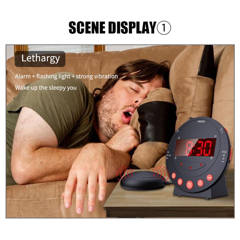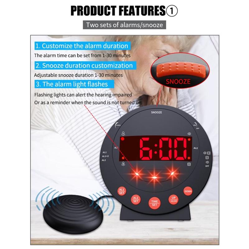• TS-BC600 Lauter Vibrationswecker mit 12/24-Stunden-Anzeige für Gehörlose, Schwerhörige und Senioren - 3x AAA-Batterien (NICHT enthalten)