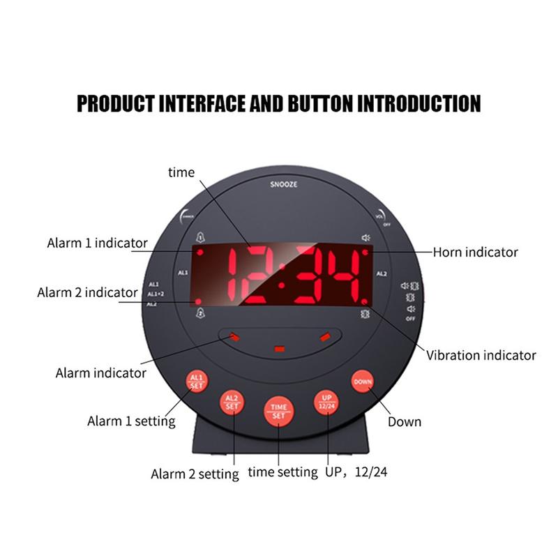 TS-BC600 Lauter Vibrationswecker mit 12/24-Stunden-Anzeige für Gehörlose und Senioren - Schwarz