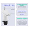 - Drahtlose Verbindung bis zu 100 m (Freifeld) zwischen IP65-Sender und Innenempfänger