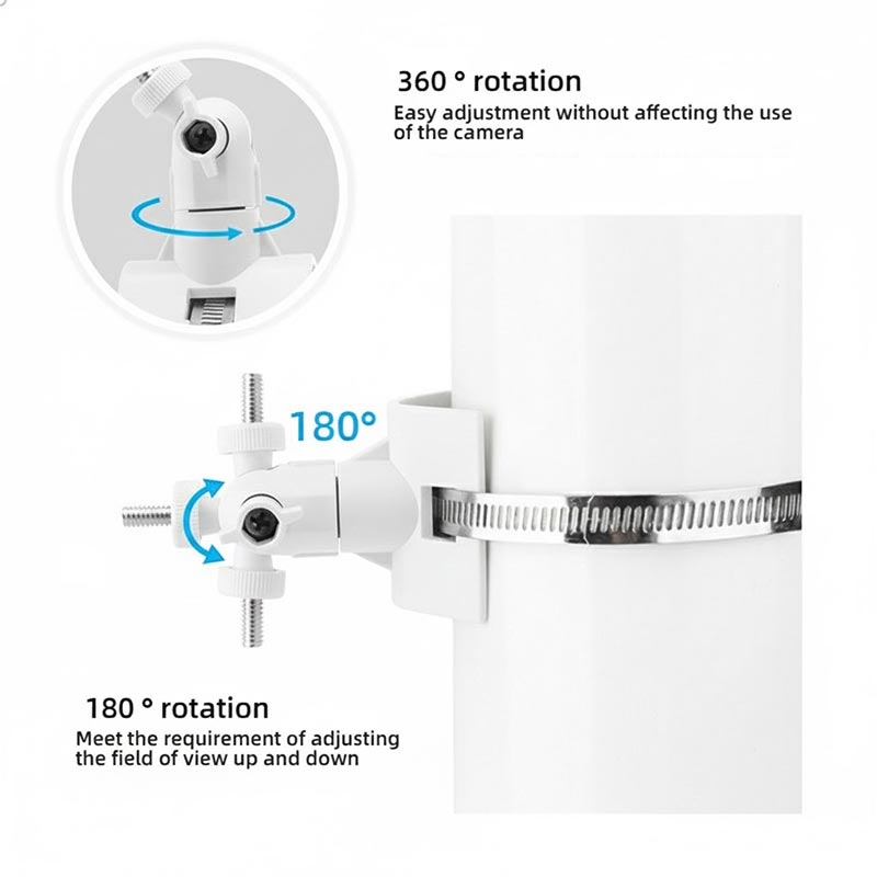 Diese Halterung unterstützt eine horizontale Drehung um 360° und eine vertikale Neigung um 180°, sodass Sie den Kamerawinkel für ein maximales Sichtfeld feineinstellen können. Dadurch werden tote Winkel vermieden und eine umfassende Überwachung des Zielbereichs gewährleistet.