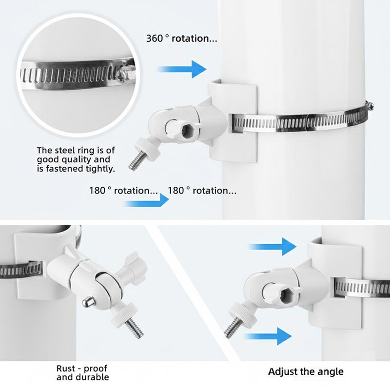 Das Klemmdesign ermöglicht die Montage an Abflussrohren, Geländern, Pfosten, Baumstämmen und anderen zylindrischen Objekten und bietet flexible Installationsmöglichkeiten für Häuser, Gärten, Lagerhallen und Außenbereiche.
