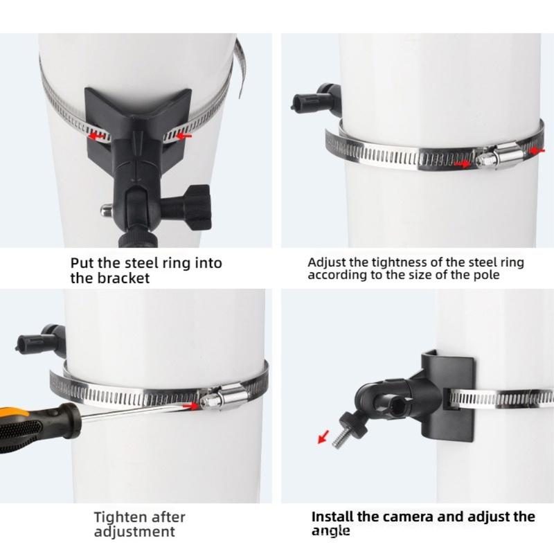 Die mit einer Edelstahlklemme ausgestattete Halterung bietet eine starke Haltekraft und langfristige Stabilität. Sie hält die Kamera sicher an Masten oder runden Konstruktionen, auch im Freien.