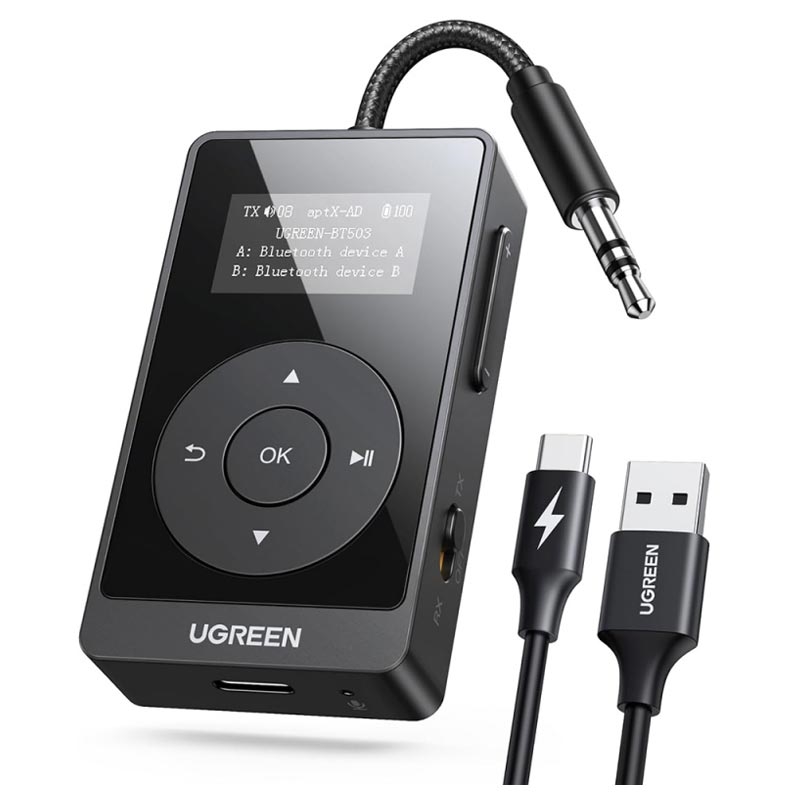 • Ugreen BT503 2-in-1 Bluetooth 5.3 Sender und Empfänger - aptX Adaptive/HD (TX), LED-Anzeige, bis zu 32 Stunden Akkulaufzeit, 3,5-mm-AUX-Anschluss, Unterstützung für zwei Kopfhörer