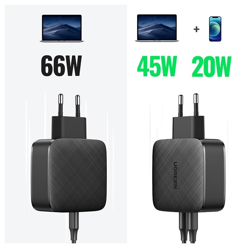 Laden Sie fast jedes moderne Gerät schnell auf, dank mehrerer implementierter Schnellladeprotokolle! Ausgestattet mit zwei USB-C-Anschlüssen und einer maximalen Leistung von 66W, kann es einen Laptop und ein Smartphone gleichzeitig schnell aufladen und die Energie intelligent verteilen. Klein und kompakt, ist das Ugreen CD216 ein idealer Reisebegleiter.