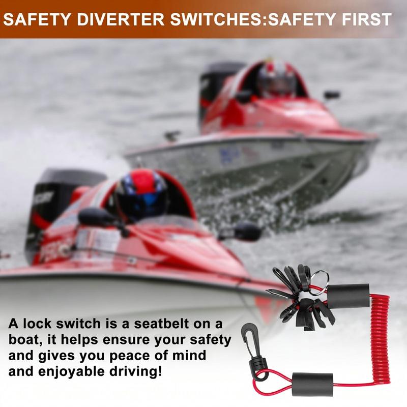 Bleiben Sie sicherer auf dem Wasser mit diesem Außenbordmotor-Abschaltkabel für Boote, Jetskis und andere Wasserfahrzeuge. Die 1.6m lange TPU-Sicherheitsleine verbindet Sie mit dem Motorabstellschalter und hilft Ihnen, den Motor schnell zu stoppen, wenn Sie über Bord fallen oder sich von den Bedienelementen entfernen. Sie ist aus strapazierfähigem thermoplastischem Polyurethan (TPU) gefertigt und bietet eine gute Elastizität und Verschleißfestigkeit für den Einsatz auf See. Die leuchtend rote Farbe verbessert die Sichtbarkeit in Notsituationen, während der Wirbelhaken ein Verheddern verhindert und die Befestigung sicher hält. Das Set enthält 7 Kill-Switch-Tasten für eine breite Kompatibilität und 2 schwimmende Blasen, damit das Lanyard auf der Wasseroberfläche leicht zu sehen ist.