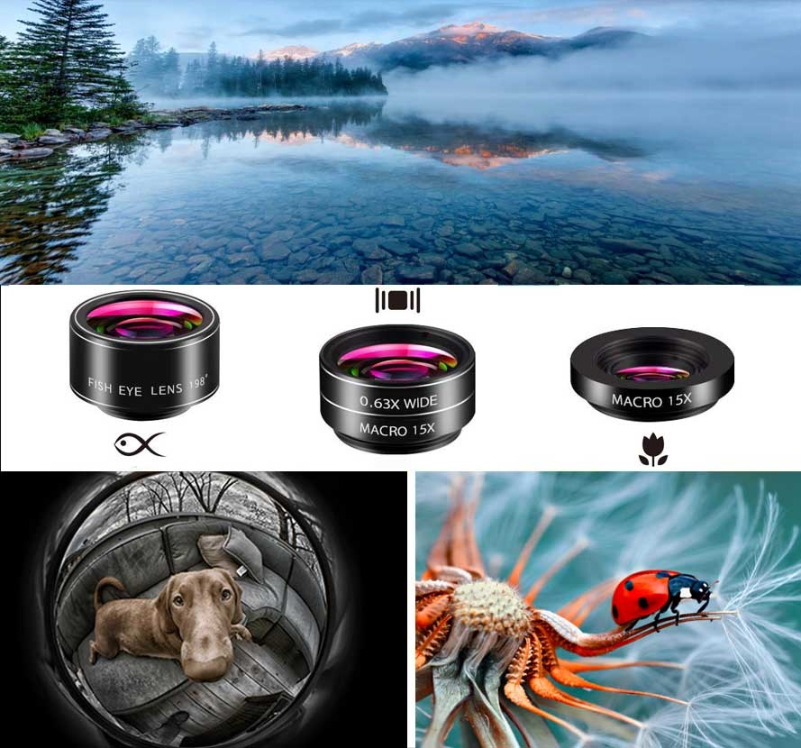 5-in-1-Universal-Clip-On-Kameraobjektiv-Kit für Smartphone, Tablet - 0,63-faches Weitwinkelobjektiv, 15-faches Makroobjektiv, 198-Grad-Fischaugenobjektiv