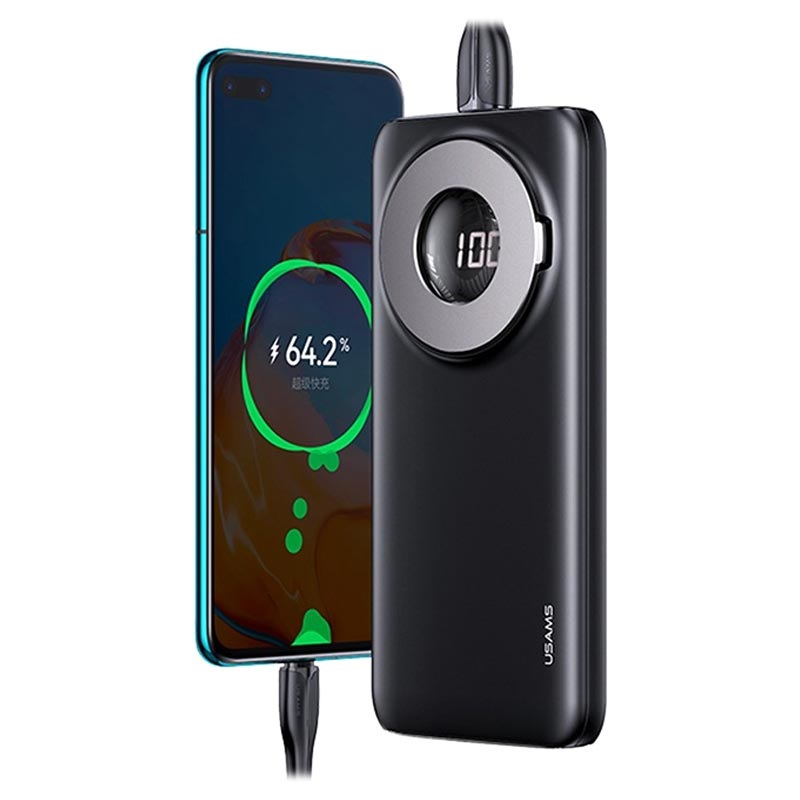 Laden Sie bis zu drei Geräte gleichzeitig mit einer maximalen Ausgangsleistung von 22,5 W über Standard-USB, USB-C-Anschluss und Qi-Ladegerät auf. Legen Sie den AirTag in das innere Ringfach auf der Rückseite, verwenden Sie den Ring als Ständer und überprüfen Sie die verbleibende Leistung auf dem digitalen Display. Usams US-CD171PB62 magnetische kabellose Powerbank ist kompatibel mit MagSafe und unterstützt Schnellladeprotokolle wie Power Delivery 20W, Quick Charge 3.0, etc.