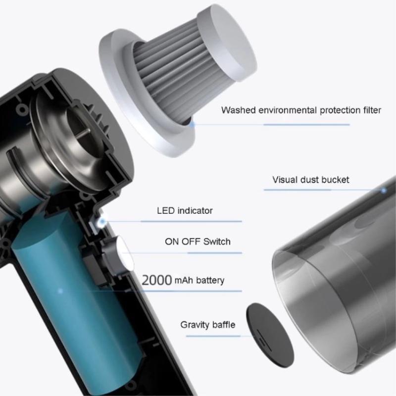 Der kabellose 6000-Pa-Autostaubsauger ist ein leistungsstarkes, tragbares Reinigungsgerät, mit dem Sie Ihr Auto, Ihr Zuhause und Ihr Büro makellos reinigen können. Mit einer 120-W-Hochleistungssaugleistung und einem Saugdruck von 6000 Pa entfernt er effektiv Staub, Krümel, Tierhaare, Ruß und sogar kleine Wasserflecken. Die mitgelieferten multifunktionalen Bürstenköpfe erreichen auch enge Zwischenräume, Autositze, Fußmatten und Gepäckfächer und sorgen für eine gründliche Reinigung. Der leichte und kabellose Staubsauger ist mit einem 2000-mAh-Akku ausgestattet und kann mit einer vollen Ladung bis zu 30 Minuten lang ununterbrochen verwendet werden. Der große Staubbehälter mit 0,5 Litern Fassungsvermögen sorgt dafür, dass er seltener geleert werden muss, und die USB-Aufladung ermöglicht eine bequeme Stromversorgung über Adapter, Powerbanks oder Autoladegeräte.