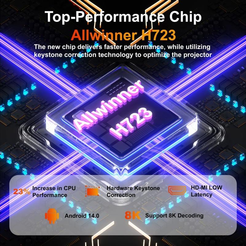 Dank automatischer Trapezkorrektur (30 %) und Vierpunkt-Einstellung ist die Einrichtung schnell und frustfrei, sodass Sie das Bild auch dann ausrichten können, wenn der Projektor nicht perfekt zentriert ist. Dualband-WLAN 6 und Bluetooth-kompatibles 5.2 unterstützen reibungslose drahtlose Verbindungen für Bildschirmübertragungen, Lautsprecher und Kopfhörer, und das geräuscharme Design (<25 dB bei 1 m) sorgt dafür, dass Sie sich ganz auf das konzentrieren können, was Sie gerade sehen.