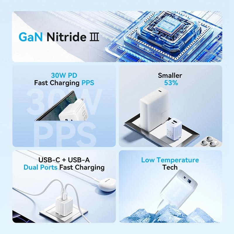 Laden Sie Telefone, Tablets und Ohrstöpsel in Höchstgeschwindigkeit mit einem Stecker im Taschenformat. Das VENTION FEQ GaN-Ladegerät nutzt Galliumnitrid-Komponenten der nächsten Generation, um volle 30 W über seinen USB-C- oder USB-A-Anschluss zu liefern, und bleibt dabei kühler und kleiner als herkömmliche Silizium-Stecker. Die Unterstützung mehrerer Protokolle bedeutet schnelle und sichere Stromversorgung für alles, von iPhone und Galaxy-Handys bis hin zu Nintendo Switch und Bluetooth-Lautsprechern, zu Hause oder unterwegs.