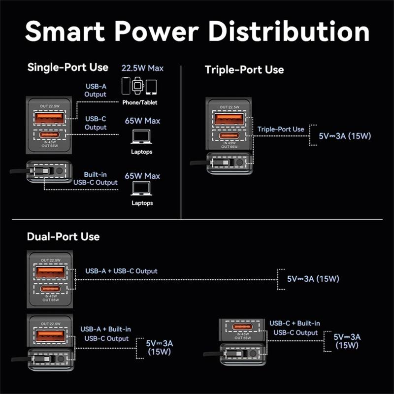 - Maximale Leistungen: USB-C 65W; USB-A 22,5 W; integriertes Kabel 65W.