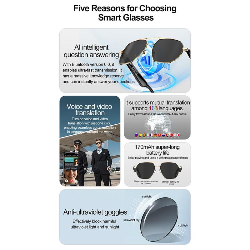 Die W100C ersetzt separate Ohrstöpsel, Übersetzungs-Apps und Sprachassistenten durch eine elegante Brille. Der lebenslange kostenlose Zugang zu künstlicher Intelligenz und Übersetzung bedeutet, dass keine Abonnements abgeschlossen werden müssen, und das offene Ohrdesign sorgt dafür, dass Sie Ihre Umgebung wahrnehmen, während Sie Musik hören oder telefonieren.