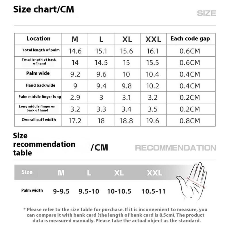 - Größe L: Handflächenbreite: 9,6cm; Gesamtlänge der Handfläche: 15,1cm