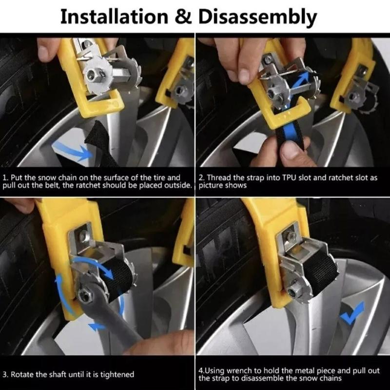 Dank der Schnallen mit Zahnradschloss und der semi-intelligenten Befestigung ist die Montage schnell und problemlos. Sie können sie innerhalb weniger Minuten ohne professionelle Hilfe anbringen oder abnehmen, was sie für Notfälle am Straßenrand praktisch macht.