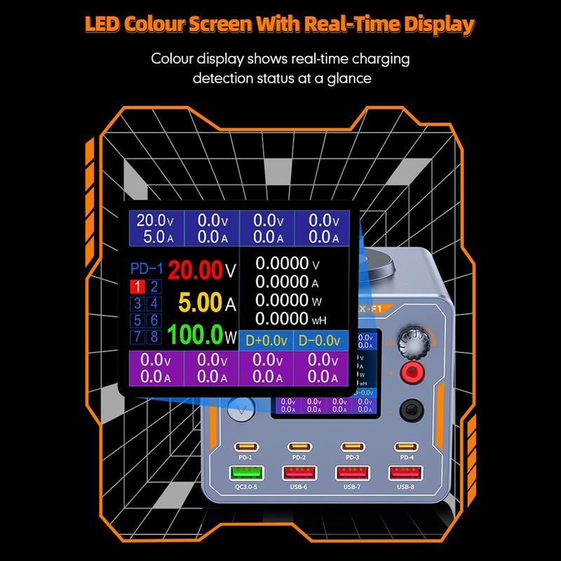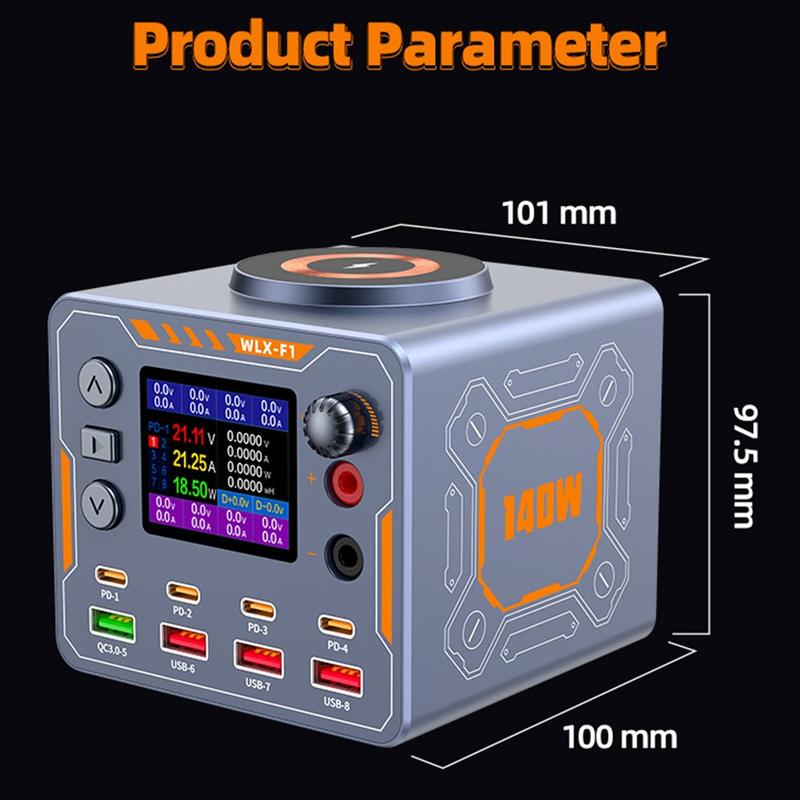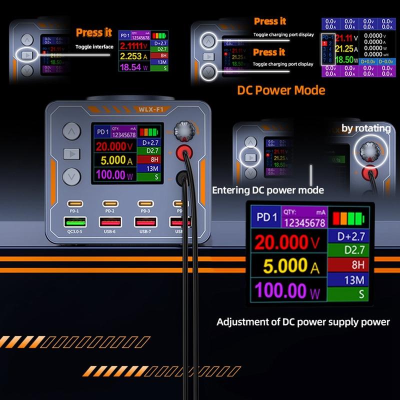 Mit einer Ausgangsleistung von bis zu 100 W an einem Anschluss versorgt der WLX-F1 effizient anspruchsvolle Geräte wie MacBooks und USB-C-Laptops. Darüber hinaus verfügt es über einen einstellbaren Präzisions-Gleichstromausgang (1,8-12 V, 2 A), wodurch es sich ideal zum Testen, Reparieren und Diagnostizieren von elektronischen Geräten eignet.