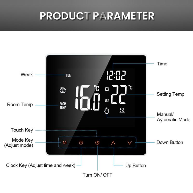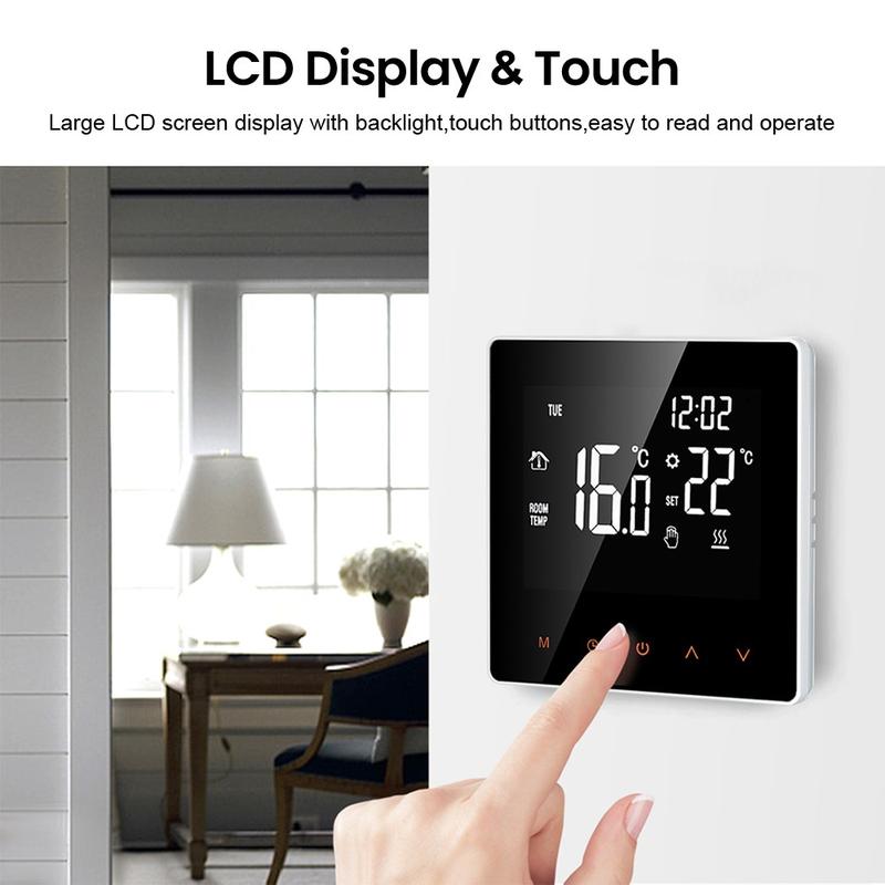 Der große LCD-Touchscreen mit Hintergrundbeleuchtung ist sowohl bei Tag als auch bei Nacht gut lesbar. Sein elegantes einteiliges Design verleiht dem Thermostat ein gepflegtes und modernes Aussehen, während die kratzfeste Oberfläche dafür sorgt, dass er auch nach längerer Zeit noch gut aussieht. Je nach Ihrem Tagesablauf und Ihren persönlichen Vorlieben können Sie zwischen dem manuellen Modus für direkte Einstellungen und dem Automatikmodus für programmiertes Heizen wählen.