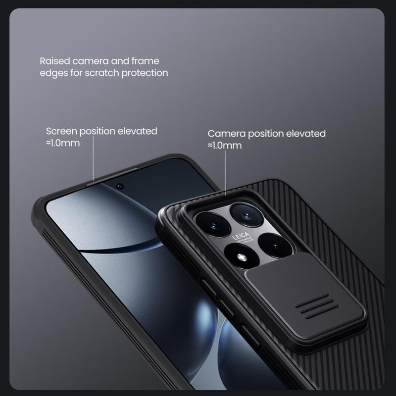Genießen Sie zusätzliche Privatsphäre und Schutz mit der CamShield Pro-Hybridhülle von Nillkin. Durch die Kombination von starrem Kunststoff und TPU verhindert die Kameraabdeckung Kratzer und schützt gleichzeitig Ihr Xiaomi 14T vor täglicher Abnutzung.