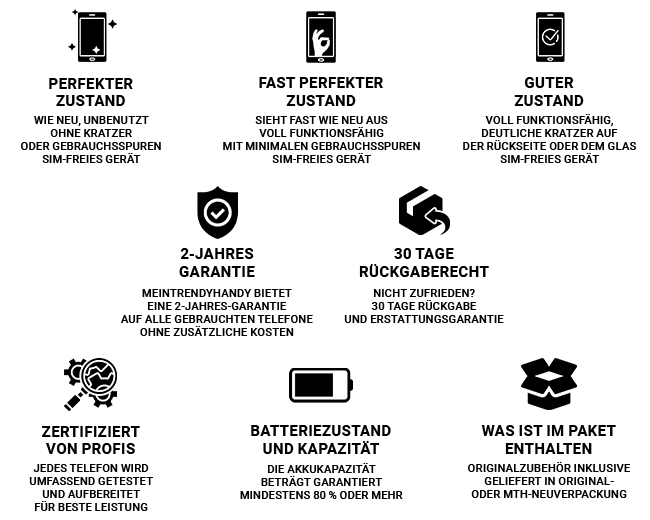 Sie erhalten ein gebrauchtes Handy, das von erfahrenen Technikern gründlich geprüft und generalüberholt wurde. Wir verkaufen gebrauchte Handys und Smartphones seit 2003, weshalb wir viel Erfahrung in dieser Branche haben.