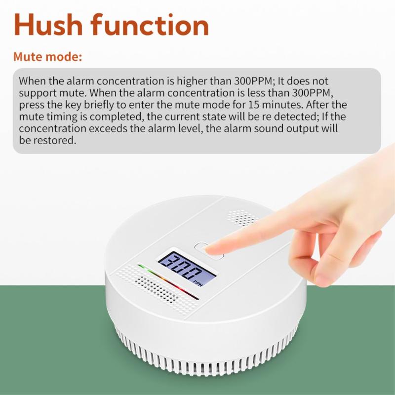 Stummschaltfunktion und Selbstüberprüfung: Der Alarm verfügt über eine praktische Stummschaltfunktion, um Fehlalarme oder störende Alarme zu unterdrücken. Die Selbstüberprüfungsfunktion stellt außerdem sicher, dass der Alarm ordnungsgemäß funktioniert und gibt Ihnen Sicherheit.