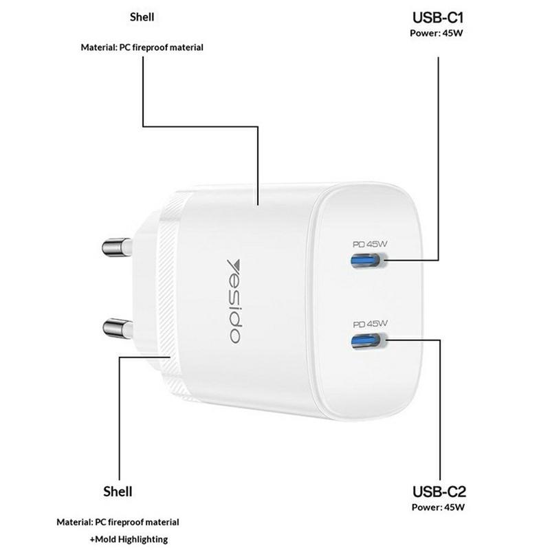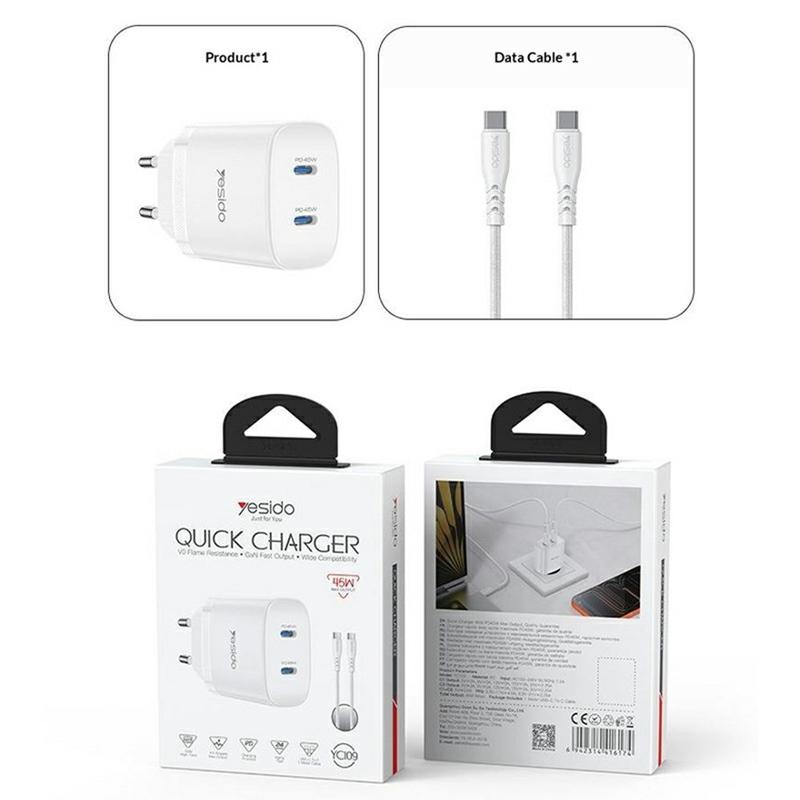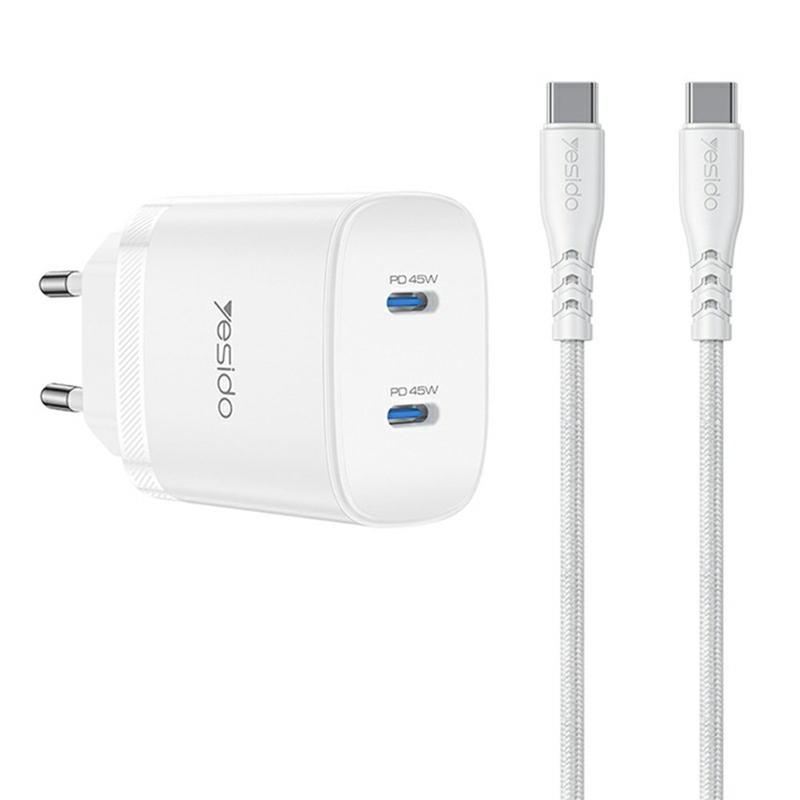 Yesido YC109 45W Dual-USB-C-PD-Ladegerät mit USB-C-Kabel - Schnelllade-Wandadapter