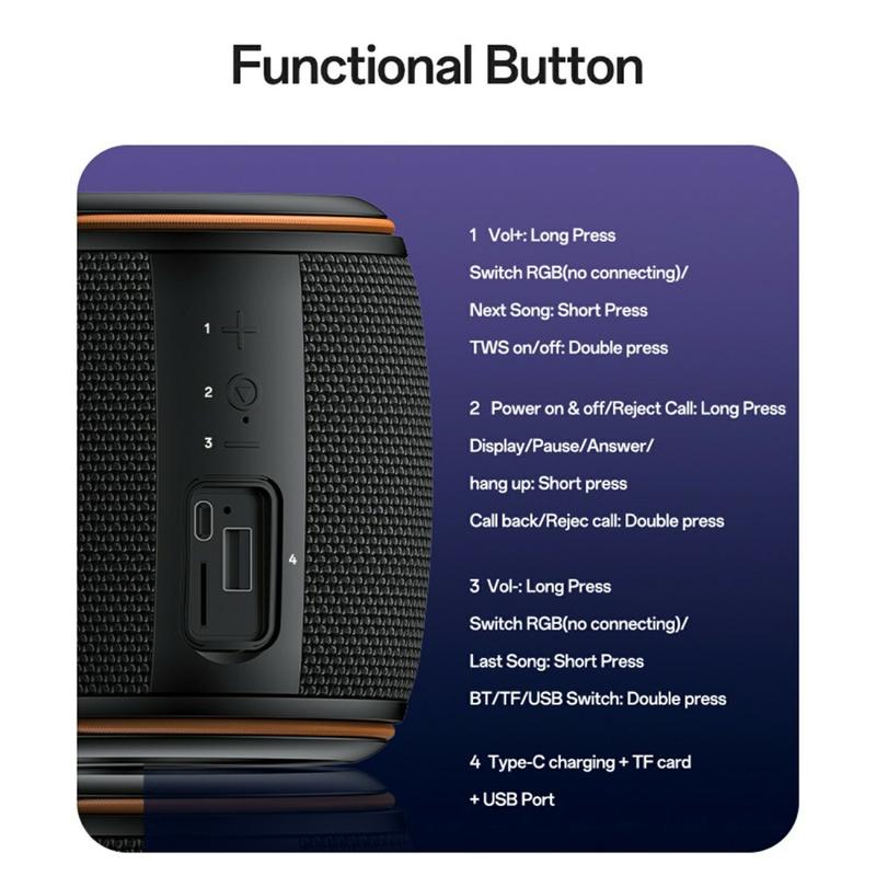- Vielseitige Wiedergabemöglichkeiten - Unterstützt TF-Karte, FM-Radio, USB, TWS-Pairing, AUX-Eingang und Bluetooth.