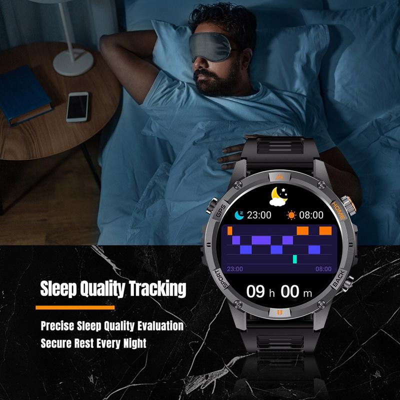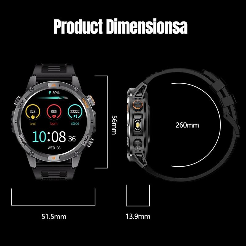 Die Uhr wurde für Outdoor-Abenteuer entwickelt und verfügt über eine eingebaute Taschenlampe, GPS-Ortung und einen digitalen Kompass, damit Sie sich sicher auf Wanderwegen bewegen und Ihre Routen verfolgen können. Der 580-mAh-Akku mit hoher Kapazität bietet lang anhaltende Leistung mit bis zu 40 Tagen Standby-Zeit und ca. 7 Tagen bei normaler Nutzung. Dank der Wasserdichtigkeitsklasse IP68 übersteht das Gerät Regen, Spritzwasser und Schwimmen ohne Probleme.