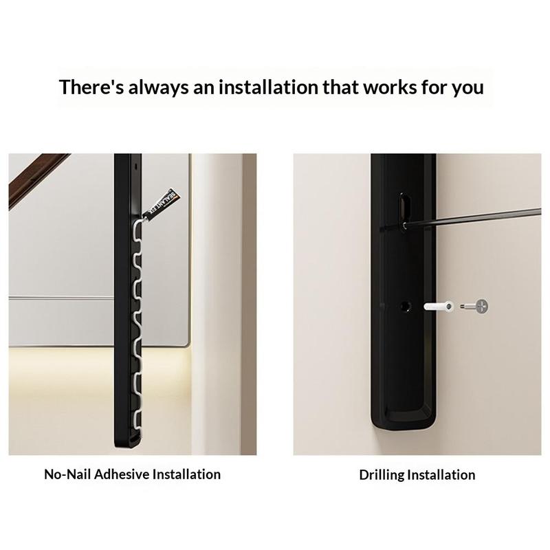 Der aus strapazierfähigem Aluminium mit verstärkten Stangen gefertigte Trockner bietet stabilen Halt für die tägliche Wäsche. Er lässt sich mit einer starken Klebefolie ohne Bohren anbringen oder für zusätzliche Stabilität mit Schrauben befestigen, wodurch er für eine Vielzahl von Wandoberflächen geeignet ist.